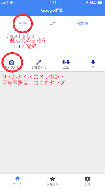 翻訳したい文章をスクリーンに映し、普段写真を撮るようにカメラのアイコンを押します。