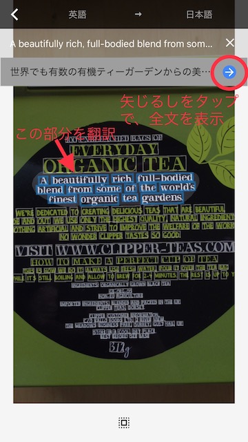 文章が長い場合は、翻訳が途中までしか見えませんが、翻訳文の隣にある矢印をタップすれば全文を読むことができます。
